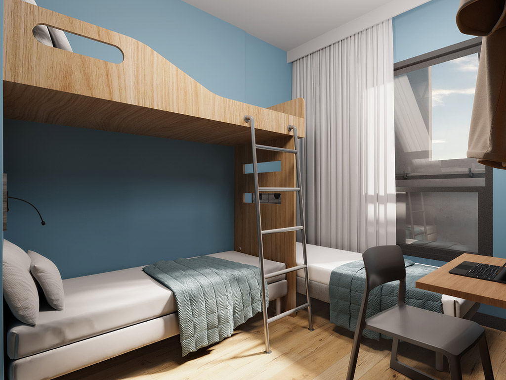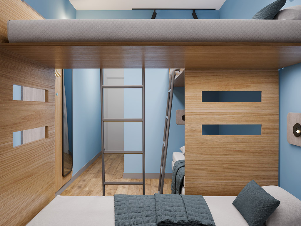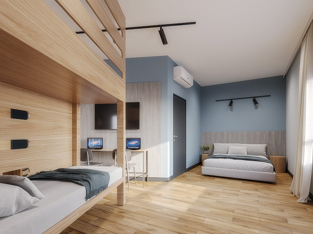 As acomodações práticas e confortáveis dos Quartos Standard para até 6 pessoas, contam com 1 cama de casal + 2 camas beliche, sendo a melhor opção para famílias e grupo de amigos. Contam com wi-fi grátis, ar condicionado, Smart TV e mesa de trabalho.